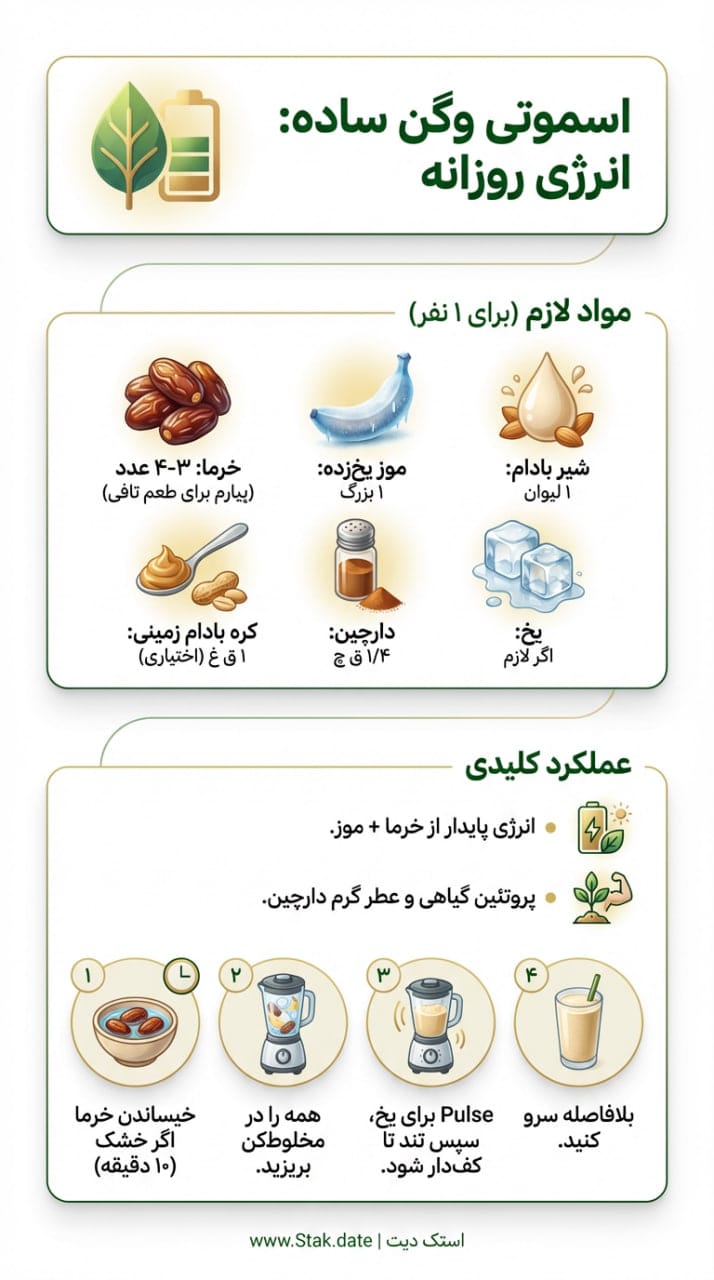 پاسخ شما نه در قوطیهای نوشابه انرژیزا است و نه در قهوههای پر از شکر که فقط تپش قلب میآورند. پاسخ در یک لیوان اسموتی خرمای غلیظ، خنک و کاراملی نهفته است که در کمتر از ۵ دقیقه آماده میشود.