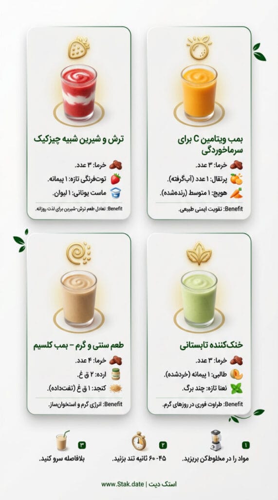 درست کردن اسموتی خرما فقط ریختن چند ماده در مخلوطکن نیست؛ یک “آیین صبحگاهی” برای احترام به بدن است. وقتی شما روزتان را به جای شکر و روغن، با فیبر، ویتامین و پروتئین طبیعی شروع میکنید، در واقع فرمان روز را به دست میگیرید. انرژی شما پایدار میماند، ذهنتان شفاف میشود و خلقوتویتان بهتر خواهد بود.
