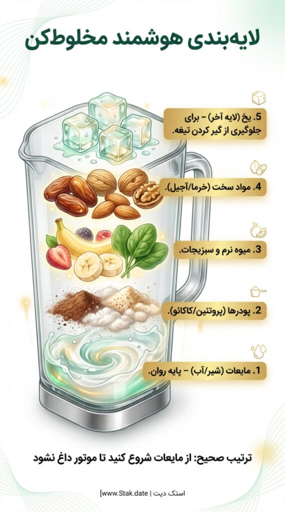 هرگز مواد جامد (یخ و خرمای سفت) را اول نریزید! این کار باعث میشود تیغه دستگاه گیر کند و موتور داغ شود.