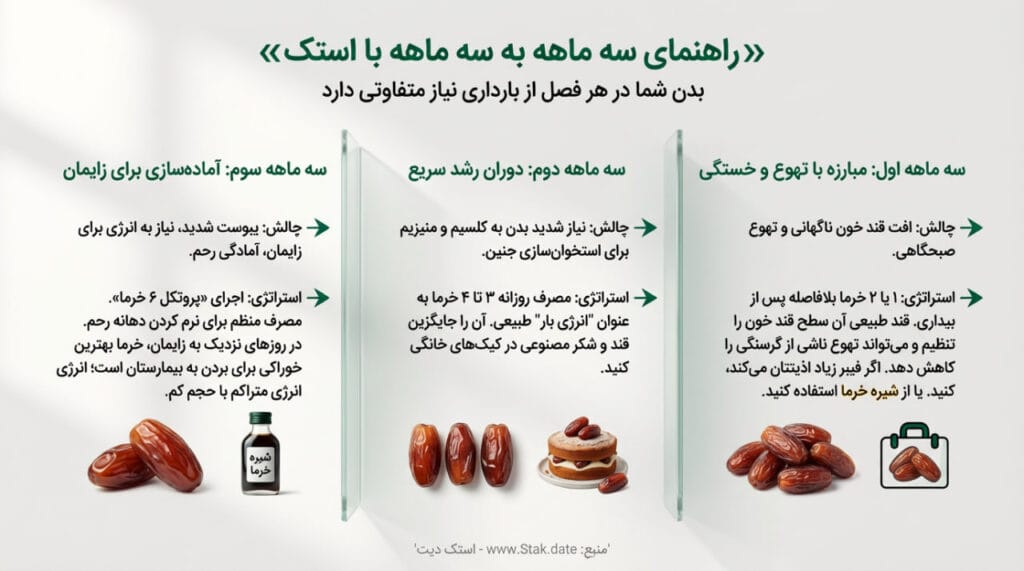 بدن شما در هر فصل از بارداری نیاز متفاوتی دارد. بیایید مصرف خرما را بر اساس تقویم بارداری تنظیم کنیم: